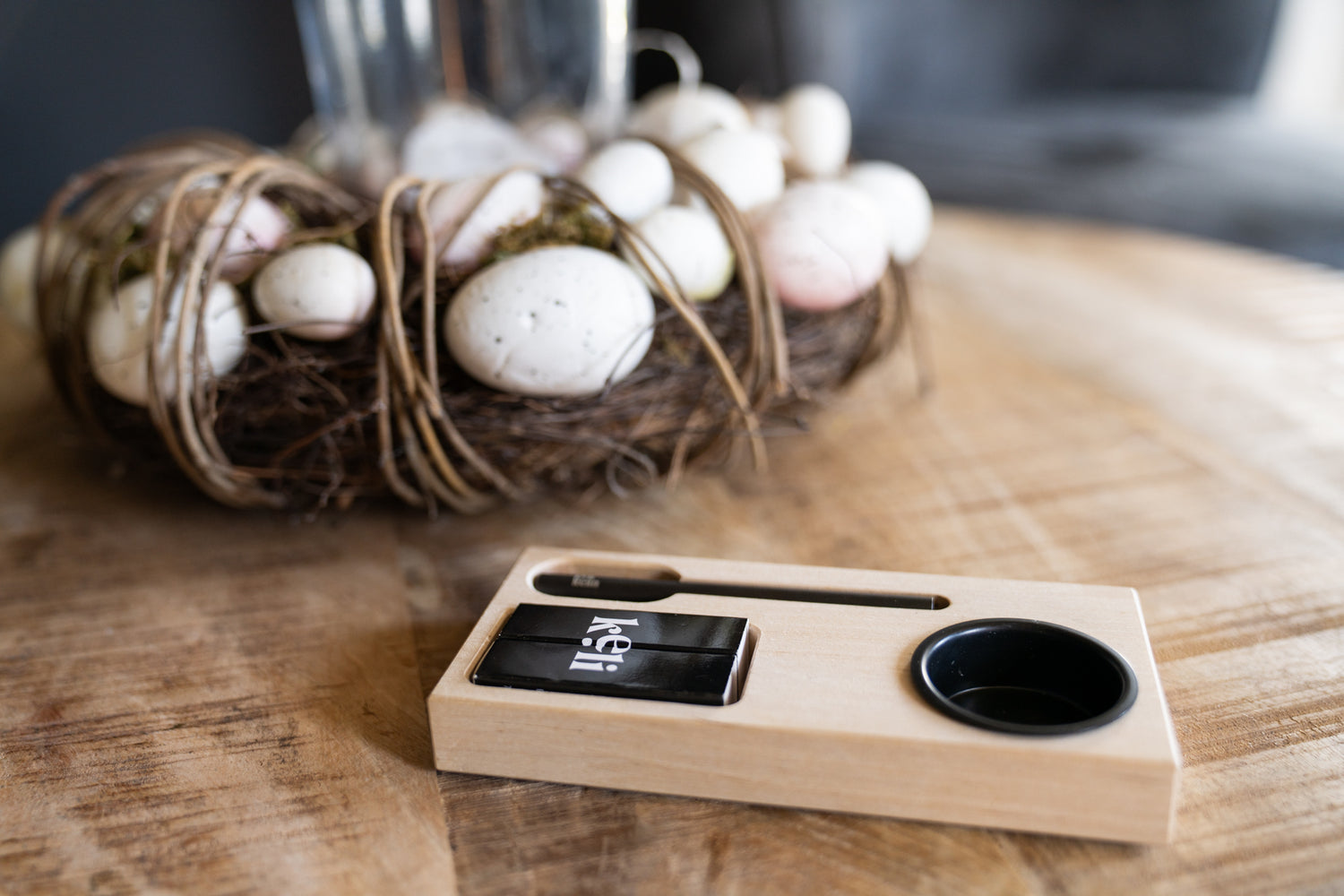 Der keli kean® kann nach der Benutzung einfach in die dafür vorgesehene Holzbox gelegt oder in das keli-Glas gestellt werden. Beide Aufbewahrungsmöglichkeiten sind dafür geeignet, selbst wenn der keli kean® etwas wärmer geworden ist. Ansonsten solltest du darauf achten, ihn nach der Benutzung nicht auf empfindliche Oberflächen abzulegen.