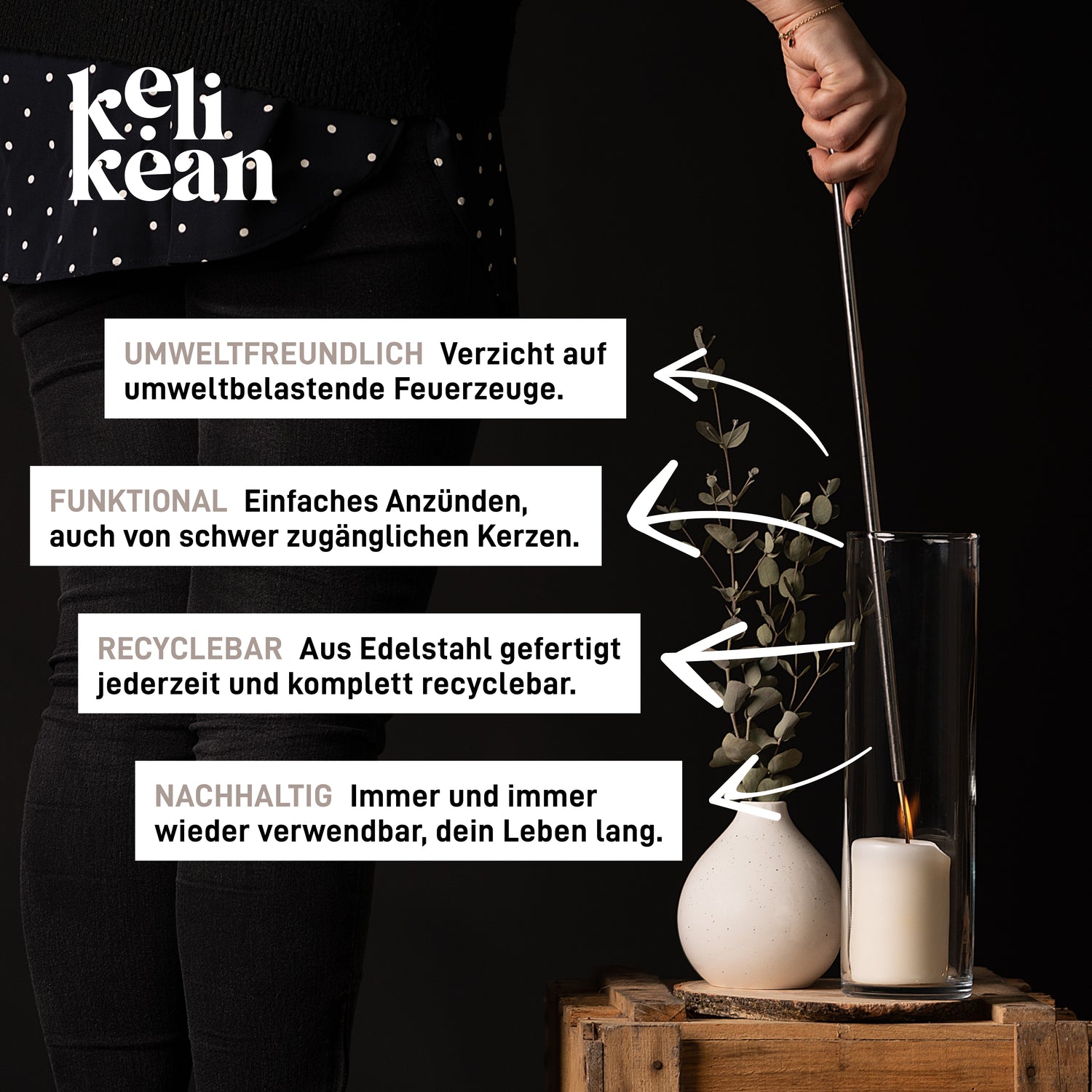 Mit keli kean® brennen nicht deine Finger – nur das Streichholz. Kerzen anzünden leicht gemacht mit dem stilvollem Wohnaccessoire.